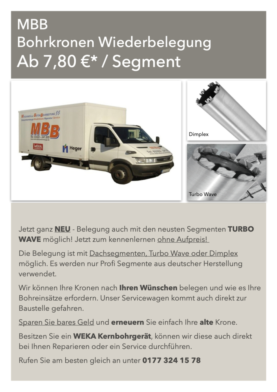 Sollten Sie Interesse an hochwertigen Bohrkronen haben oder eine Reparatur Ihrer Weka Geräte benötigen, zögern Sie nicht, direkt bei MBB unter der Nummer 0178 533 77 25 anzurufen und Ihre Bestellung aufzugeben. Vertrauen Sie auf unsere Expertise und unsere hochwertigen Partner, um Ihre Bohrprojekte mit der besten Ausrüstung auf dem Markt zu unterstützen.
